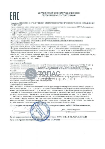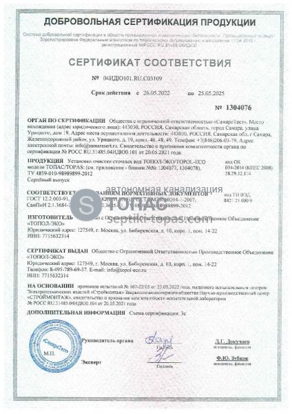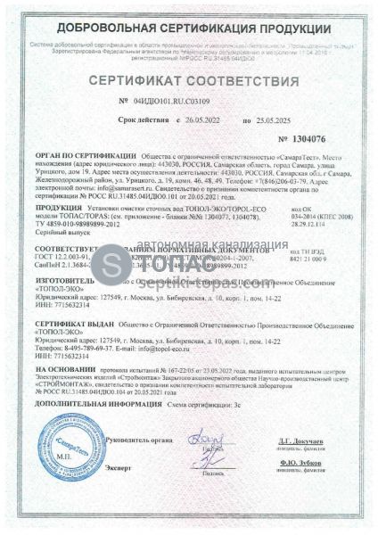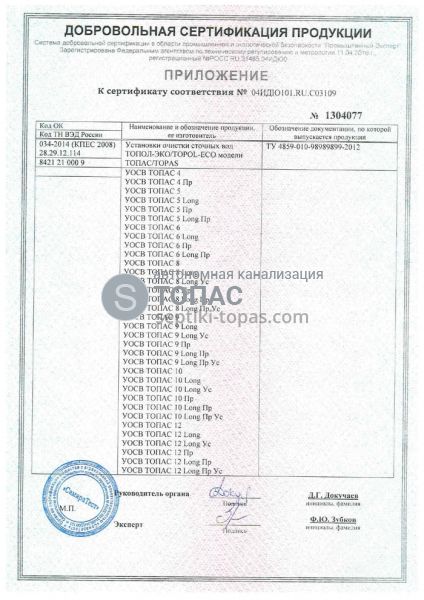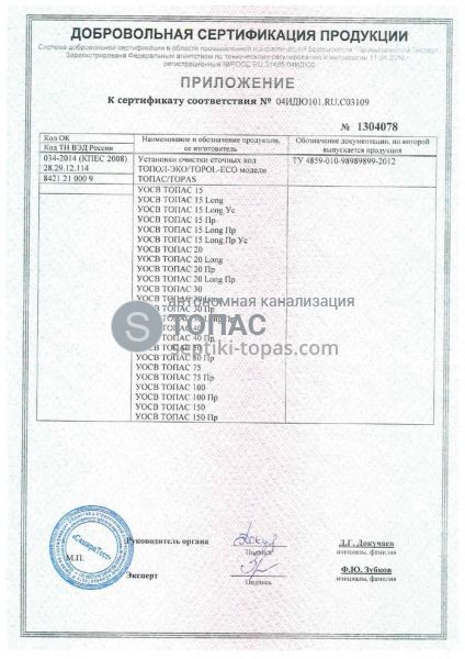 Дополнительное оборудование включает различные виды аварийной сигнализации. Аварийная сигнализация представляет собой несложное устройство, состоящее из поплавкового выключателя, расположенного в приемной камере септика Топас 5 Long, и сигнальной лампы на крышке. Устройство оповещает пользователя о неполадках в работе станции. Поплавок контролирует уровень жидкости, а лампа (зуммер) сигнализирует о превышении этого уровня световым или звуковым сигналом.